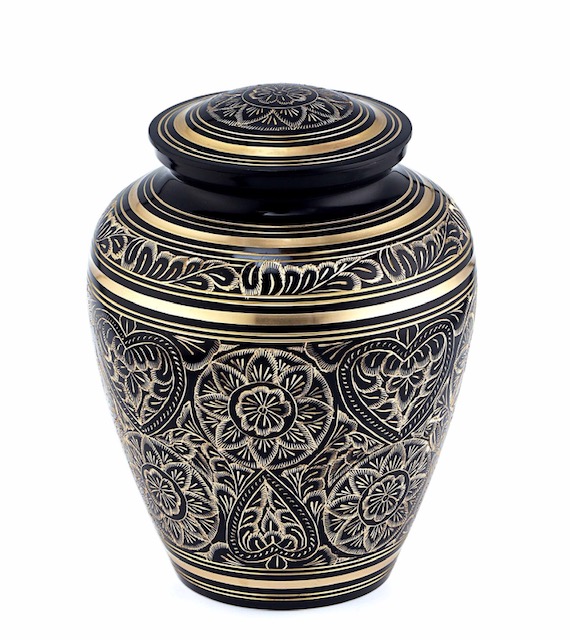 Thick classic black/gold urn with hand engraving 10”H and 200cubic inch volume